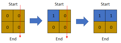 Input: row = 2, col = 2, cells = [[1,1],[2,1],[1,2],[2,2]]